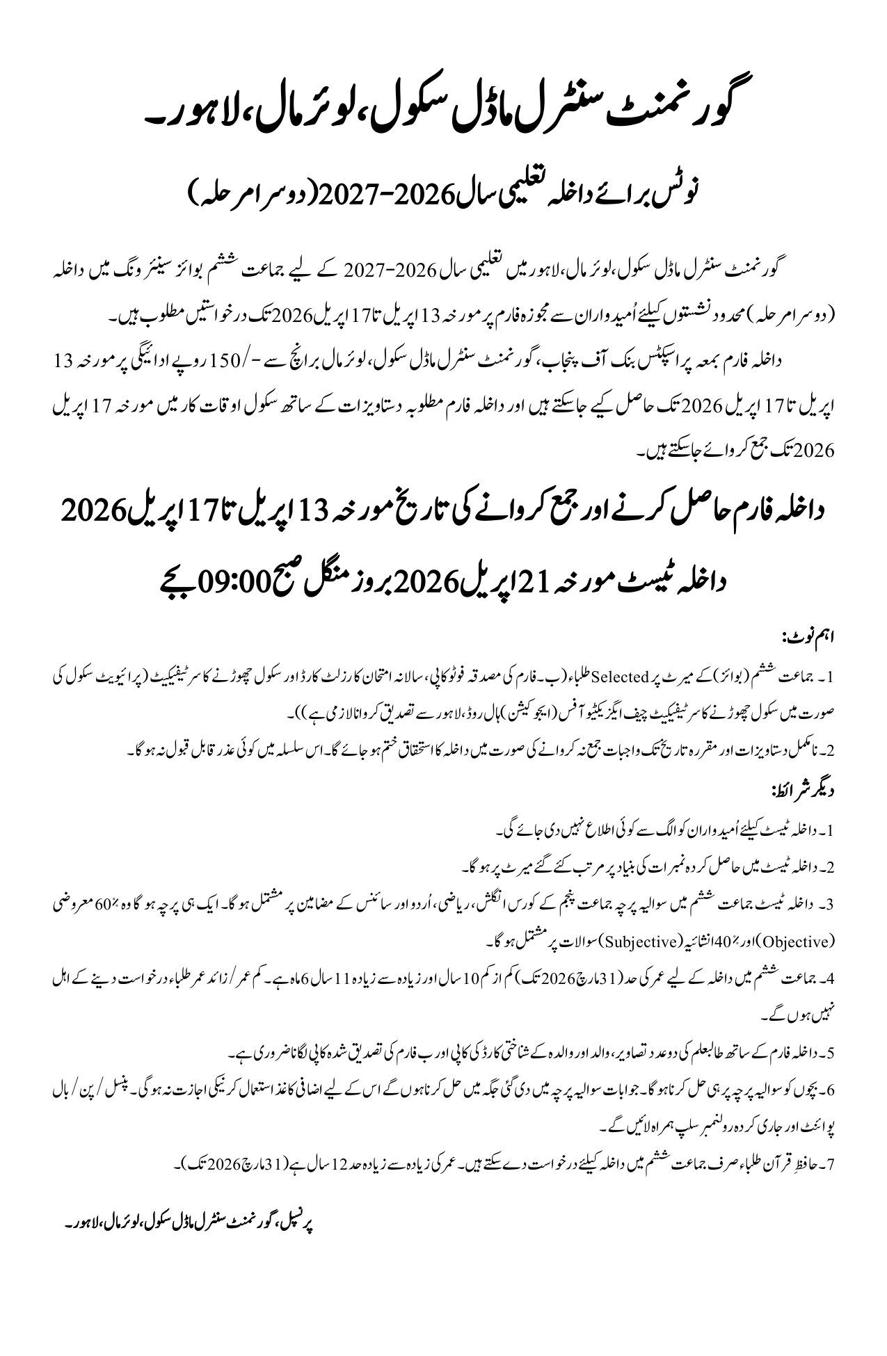 Admission Notice for 2026 - 2027 (2nd Phase)